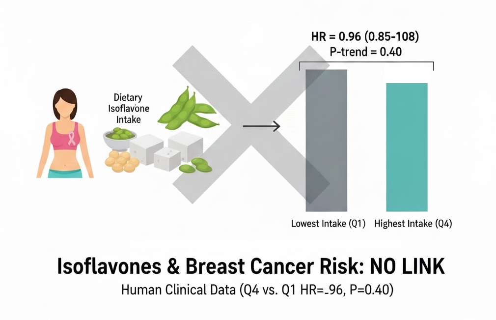 Exposure Measurement Error (Major Flaw): Isoflavone intake was estimated using a Food Frequency Questionnaire (FFQ) at baseline.The authors acknowledge that FFQ-related measurement errors likely attenuated the association toward the null.The FFQ did not capture intake from all soy foods (e.g., soy milk, green soybeans, health bars) or from soy used broadly as a component in mixed dishes and processed foods (e.g., canned tuna, white bread) . This is a critical methodological limitation that suggests the true association might be stronger than the observed null finding.The authors themselves suggest that biomarker measures (like urinary isoflavone excretion) may be more accurate for future studies .