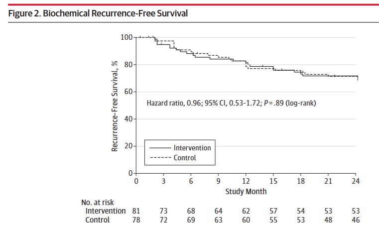 The primary endpoints were the 2-year rate of biochemical recurrence and the time to recurrence. Recurrence was defined as a serum prostate-specific antigen (PSA) level of ≥ 0.07 n g / m L, confirmed by subsequent measurements.