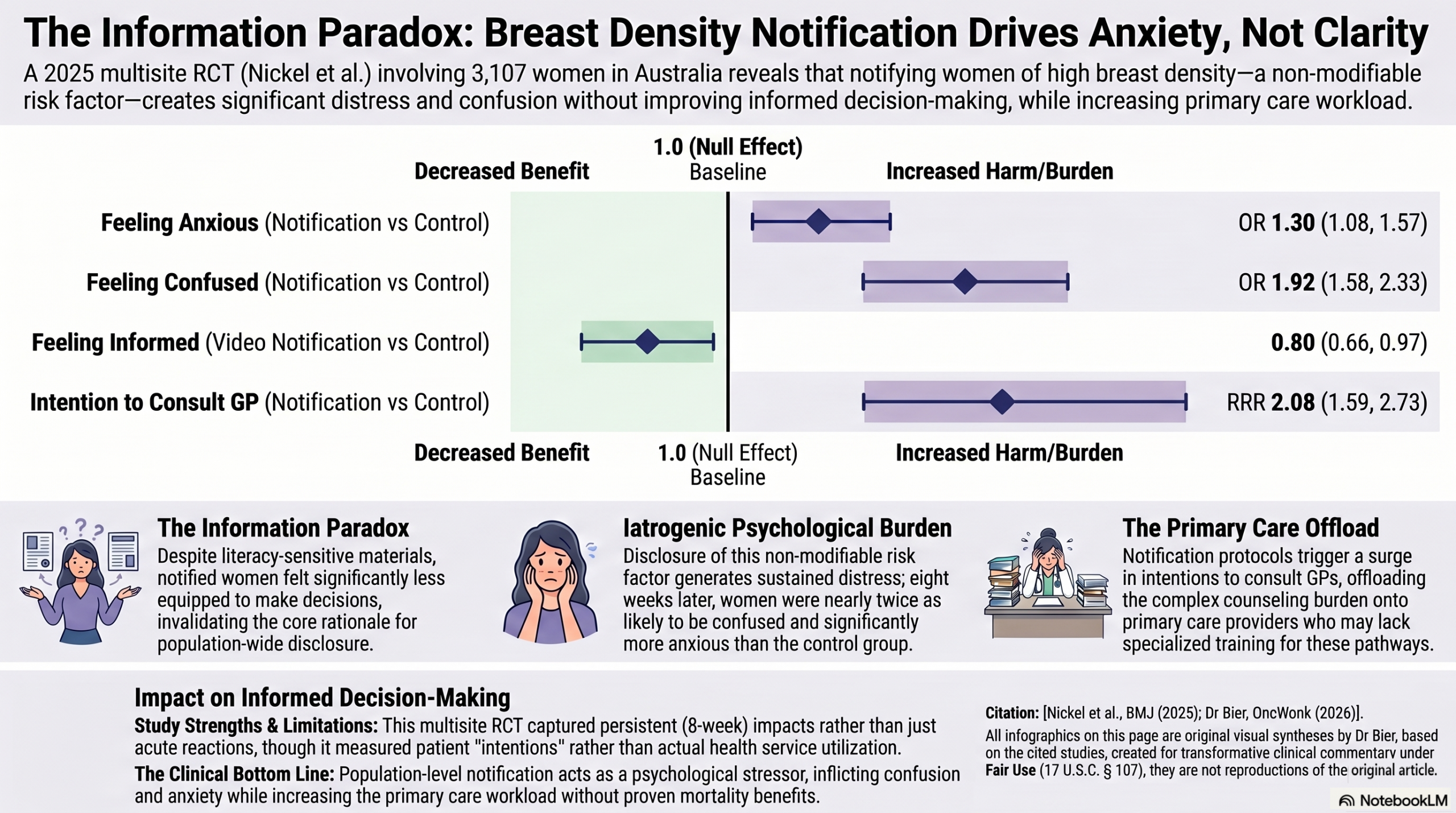 This large-scale randomized trial provides clear evidence that notifying women of their high breast density increases psychological harms, specifically anxiety and confusion, without improving how informed they feel about their breast health. While the notification significantly increased the intention to seek further advice from general practitioners (GPs), it did not lead to a widespread desire for supplemental screening. Clinicians should be aware that population-level notification may impose a substantial counseling burden on primary care without achieving the intended goal of better-informed patient decision-making.