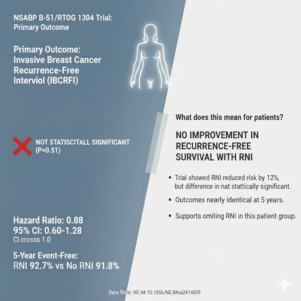 The five-year data unequivocally demonstrate that RNI fails to significantly improve the primary endpoint—invasive breast cancer recurrence-free interval (HR 0.88, p = 0.51)—or any key secondary endpoint, including Overall Survival (OS).  It provides the necessary prospective evidence to resolve prior uncertainty, allowing us to confidently omit RNI in these patients. This is a clear victory for de-escalation of locoregional therapy, as we can spare patients the higher rates of Grade 3 toxicity (10.0% vs. 6.5%)—particularly radiation dermatitis—without sacrificing oncologic control.