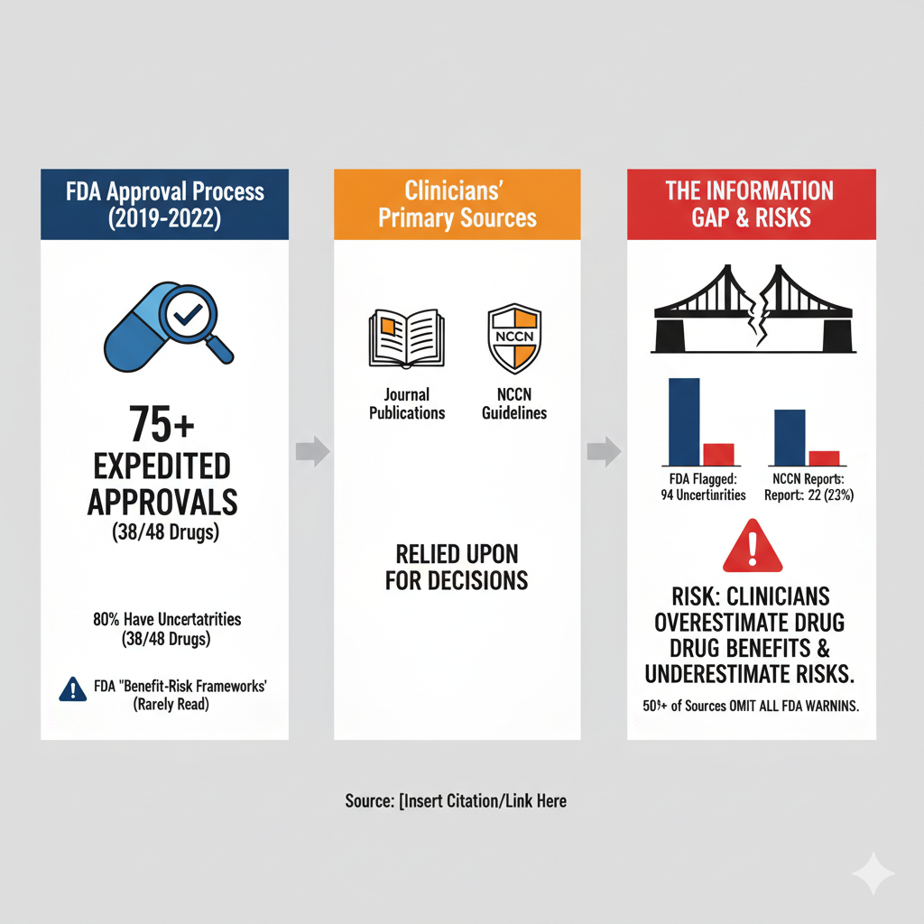 The Information Gap: The FDA details these uncertainties in its “Benefit-Risk Frameworks,” but clinicians rarely read these documents. Instead, they rely on pivotal trial publications and NCCN guidelines to guide treatment.