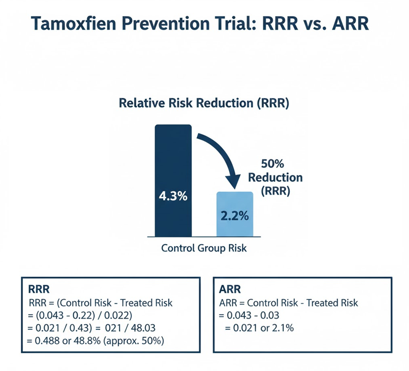 A classic example of the difference between these two metrics comes from the National Surgical Adjuvant Breast and Bowel Project Breast Cancer Prevention Trial (NSABP P-1). This large study looked at whether the drug tamoxifen could prevent breast cancer in women who were considered high-risk.