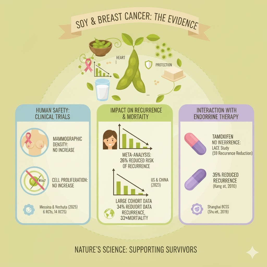 The provided collection of evidence is robust and directionally consistent. The evidence strongly refutes the outdated concern that soy is harmful to breast cancer patients. The data from human studies consistently show that moderate soy consumption (20–60 mg/day isoflavones) is safe and associated with a statistically significant and clinically meaningful reduced risk of recurrence and mortality. This benefit extends to, and is perhaps strongest in, the very patients for whom concerns were highest: postmenopausal women with ER-positive tumors and those receiving endocrine therapy.