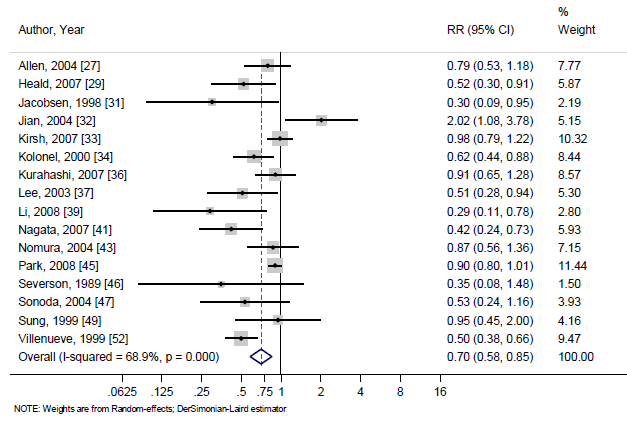 • Study Types: 15 case-control studies, 8 cohort studies, and 7 nested case-control studies.