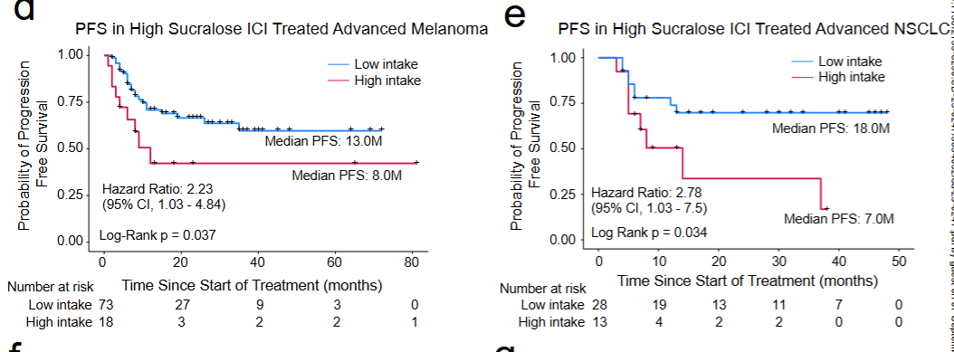 Association with Progression-Free Survival (PFS): High sucralose intake was significantly associated with worse PFS in both advanced melanoma (median PFS 8.0 months vs. 13.0 months) and advanced NSCLC (median PFS 7.0 months vs. 18.0 months). In a multivariate model for melanoma, high sucralose intake was associated with a nearly threefold increase in the hazard of progression or death (Hazard Ratio 2.91). A hazard ratio is a measure of how often a particular event happens in one group compared to another over time; a hazard ratio of 2.91 means there is a 191% increase in the hazard of progression or death in the high-sucralose group.