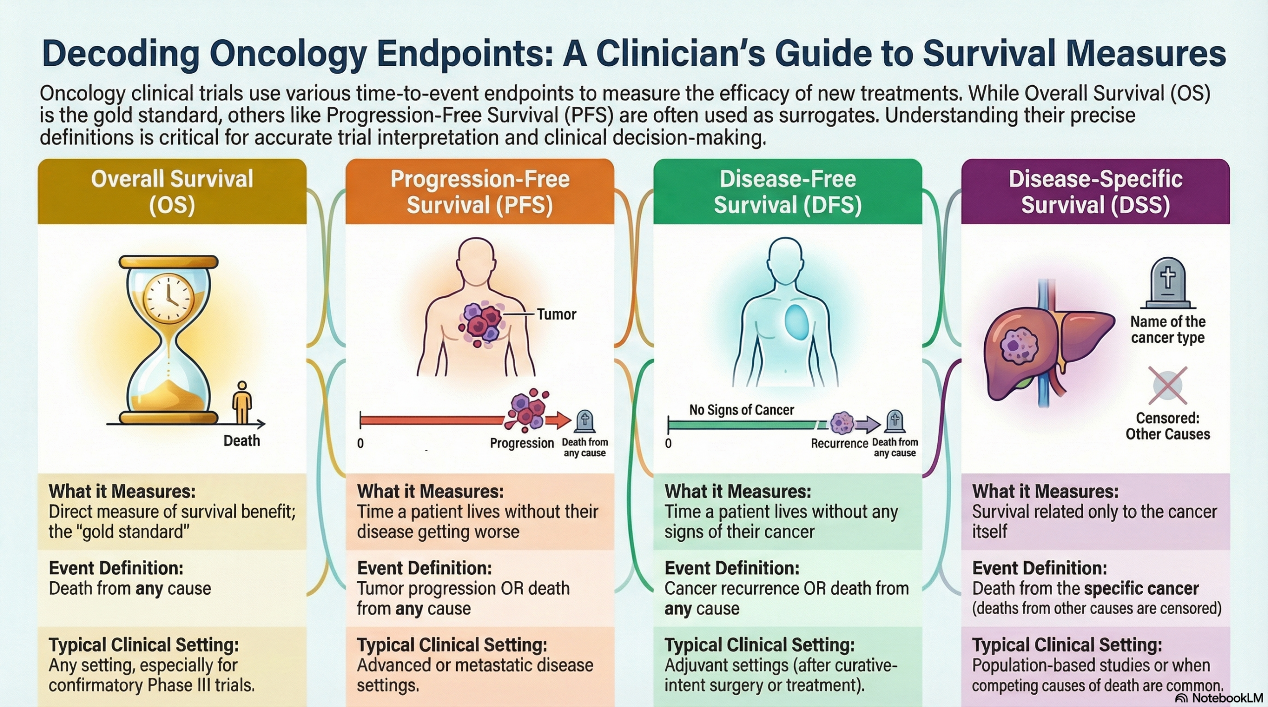 The following analysis differentiates Overall Survival (OS), Progression-Free Survival (PFS), Disease-Free Survival (DFS), and Disease-Specific Survival (DSS). These endpoints are distinct time-to-event metrics used to evaluate the efficacy of antineoplastic therapies.