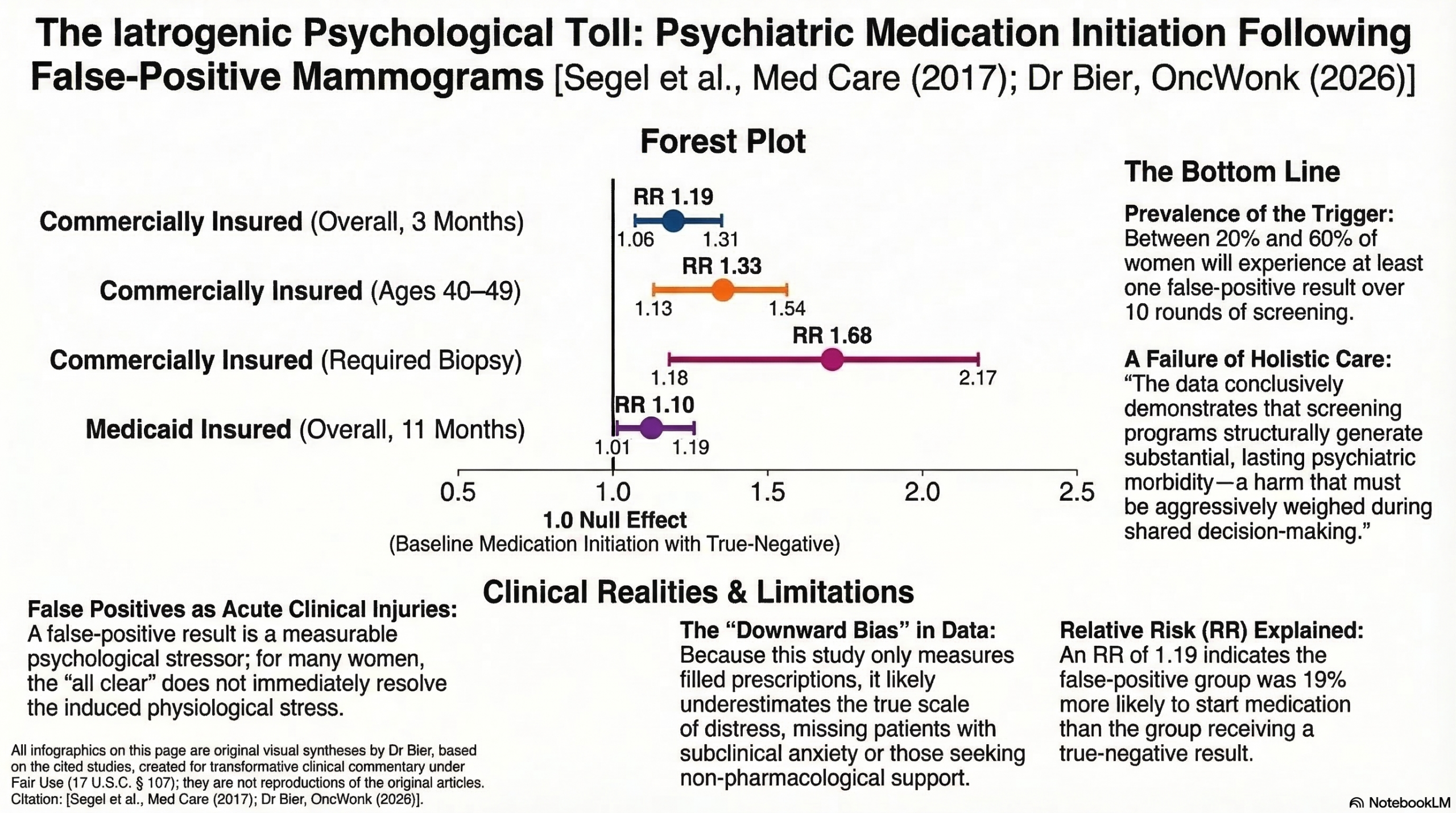 We must acknowledge how incredibly common this trigger is: data demonstrates that after 10 rounds of screening, between 20% and 60% of women will experience at least one false alarm. When this happens to younger, commercially insured women aged 40 to 49, they face a 33% increased risk (RR 1.33) of initiating antidepressants or anxiolytics. Even across the broader commercial cohort, there is a 19% increased risk (RR 1.19) within three months. Crucially, the systemic harm scales with the duration and invasiveness of the scare: when diagnostic resolution takes longer than a week, the risk climbs (RR 1.21), and if a biopsy is required, even when it comes back benign the risk of psychiatric medication initiation skyrockets by 68% (RR 1.68). The severe physiological stress provoked by an existential cancer threat does not simply evaporate when the “all clear” is given; it creates a lasting psychological wound. We must recognize false positives as acute, measurable clinical injuries, and take that into account in our analysis of the risks of screening mammography.