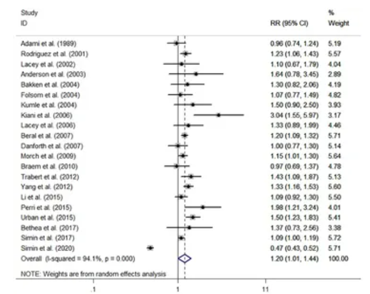 Cohort Studies: The 21 cohort studies showed a slightly higher risk. The pooled relative risk (RR) was 1.20, with a 95% confidence interval of 1.01 to 1.44. This means HRT users had a 20% increased risk of developing ovarian cancer compared to non-users. However, the confidence interval is quite wide and the lower end is very close to 1.0, which indicates a lower level of certainty in this finding.